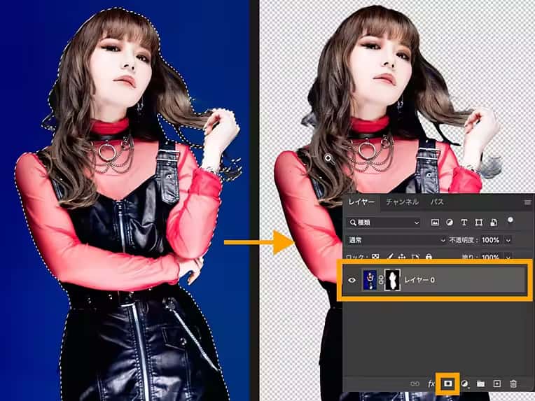 Photoshopを起動し、「開く」からサンプルアセットの「ステップ1.psd」を開きます。メニューの「選択範囲>被写体を選択」を選ぶと、自動的に人物が選択されます。 その状態で、レイヤーパネルを開き(ウィンドウ>レイヤー)、パネル下部の「レイヤーマスクを追加」ボタンをクリックします。背景がなくなり、人物が切り抜かれた状態になります。