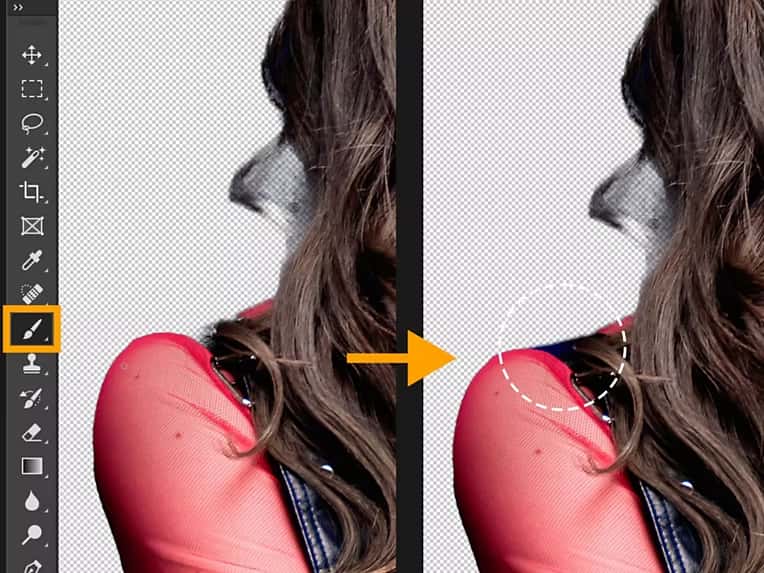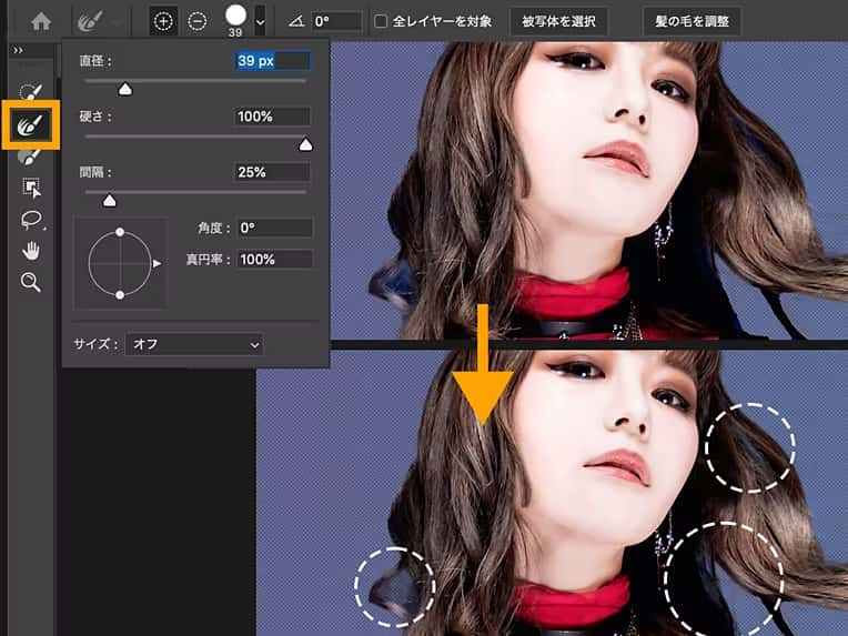 肩の部分が選択しきれずに欠けてしまっているので、復活させます。レイヤーパネルの「レイヤーマスクサムネール」をクリックして、ツールから「ブラシツール(B)」を選択し、ブラシサイズを調整します。肩の部分をドラッグすると、隠れていた部分が表示されます。