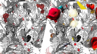 「コラージュの素材の選び方は、最初にテーマに関係するものをいくつか集めておいて、さらにそこから枝分かれしてテーマから連想するものを徐々に足していきます」