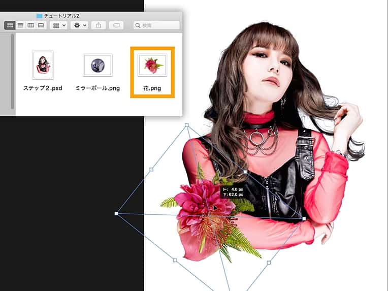 サンプルアセットの「ステップ2.psd」を開き、続けて「花.png」を画像の上にドラッグ&ドロップして配置します。