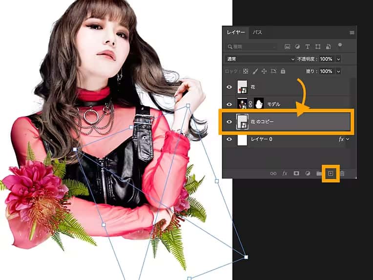 複製された花の画像の大きさや位置を調整したら、レイヤーパネルで「花のコピー」レイヤーをどタッグして「モデル」レイヤーの下に移動します。