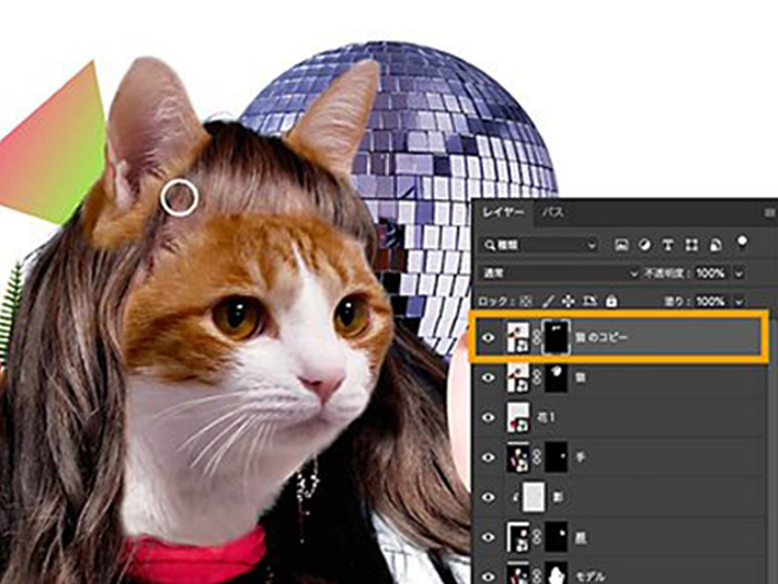 最後に、アセットサンプルの「ミラーボール.png」をドラッグ&ドロップで読み込み、大きさと位置を調整した後、レイヤーを移動して人物の後ろに配置します。