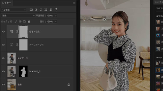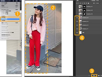 人物は「選択範囲>被写体を選択」で自動選択。「レイヤーマスクを追加」で切り抜きます。切り抜いたレイヤーは、レイヤーパネル左側にある「目のマーク」をクリックし、非表示にします。同じ手順で他の人物を切り抜きましょう。