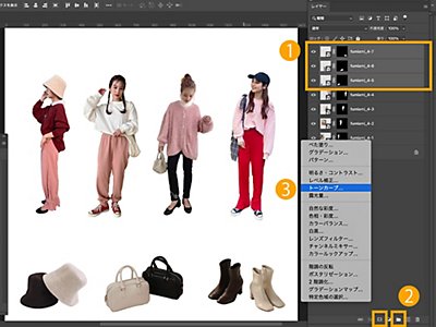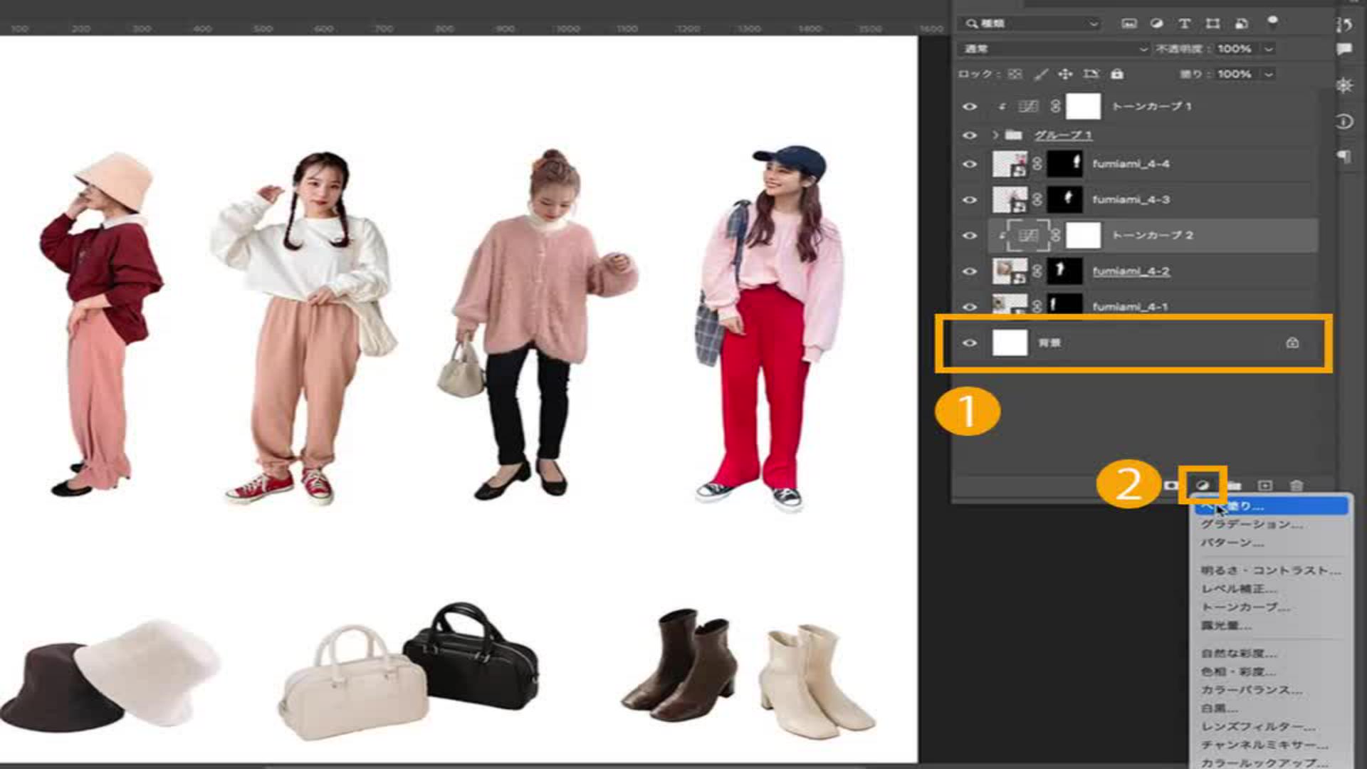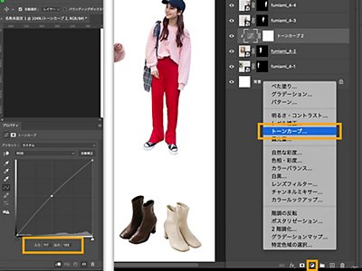 帽子、バッグ、ブーツが暗いため、明るく補正します。一気に効果をかけたいため、3つのレイヤーを選択し、レイヤーパネル下部の「新規グループ」をクリックしてグループ化します。グループ化は(Mac:⌘+G、Windows:Ctrl+G) でショートカットできます。グループ化したレイヤーの上に、レイヤーパネル下部の調整レイヤーからトーンカーブを追加します。