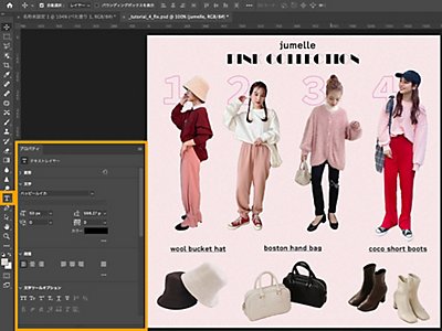 「テキストツール」で文字を打っていきましょう。先ほどアクティベートした雑誌風のフォントを選び、サイズやカラーも指定します。今回のフォントは下記を使用しています。