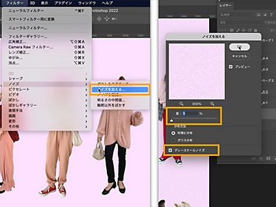 べた塗りのみではフラットな印象になってしまうため、質感を追加します。「フィルター>ノイズを加える」をクリックします。今回はグレースケールノイズにチェックを入れて、5%程度ノイズを加えます。