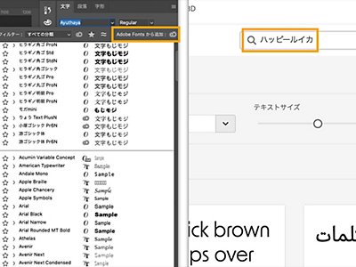 まずは文字パネルのフォントタブをクリックし、上部右にある「Adobe Fontsの追加」のAdobe Creative Cloudのアイコンをクリックします。Adobe Fontsのページへ移動するので、今回使用するフォント「ハッピールイカ」をページ右上の検索窓に入力しましょう。
