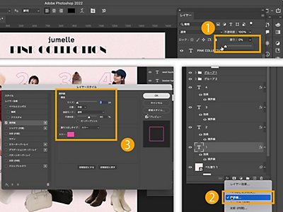 フチ文字にするには、該当するテキストを選択し、レイヤーの塗りを0%にします。 「レイヤー効果>境界線」を選択し、フチ線のカラーとサイズ(線の太さ)を設定します。今回はサイズを3px、不透明度を60%に設定して背景と馴染ませる形で文字を配置しています。