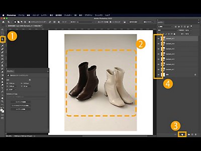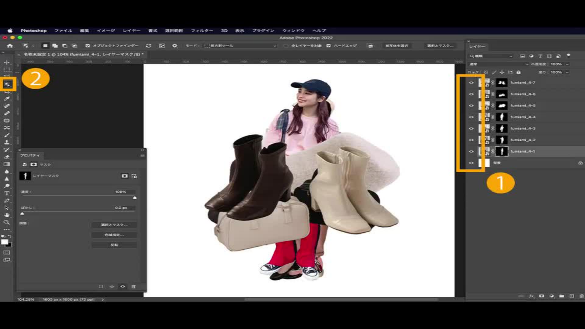 ツールパネルの「オブジェクト選択ツール」で対象物をドラッグして選択。レイヤーパネル下部「レイヤーマスクを追加」ボタンをクリックすると、小物だけが切り抜かれます。切り抜いたレイヤーは、レイヤーパネル左側にある「目のマーク」をクリックし、非表示にします。同じ手順で他の小物も切り抜いていきます。