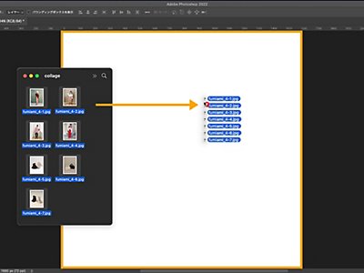 サンプルアセットの「fumiami_4-1.jpg」「fumiami _4-2.jpg」「fumiami_4-3.jpg」「fumiami_4-4.jpg」「fumiami_4-5.jpg」「fumiami_4-6.jpg」「fumiami_4-7.jpg」の画像7点をすべてドラッグ&ドロップします。サイズや位置を特に変更せずに、1点ごとにreturnキー(エンター)で確定します。