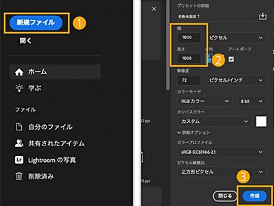 スタート画面の「新規ファイル」をクリックし、1600px×1600pxの正方形で新規ドキュメントを作成します。