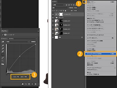 グループ化したレイヤーのみに効果をかけたいため、クリッピングマスクを設定します。もしくは、グループとトーンカーブの境界を(Mac:optionクリック、Windows:Altクリック )でショートカットできます。グループ化したレイヤーのトーンカーブを入力115、出力149に設定し、写真を明るく補正します。