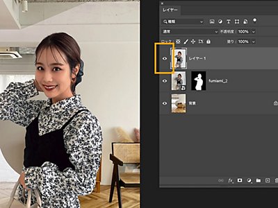 効果を確かめてみましょう。レイヤーパネルで「レイヤー1」の目のマークをクリックすることで、レイヤーを非表示/表示にすることができます。背景の光に合わせて、人物が黄色く調整されていることが分かります。