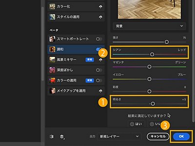 「調和」をONにします。こちらは、複数のレイヤーがある際、一方の光の状況に合わせて、もう一方のレイヤーを調整する機能です。
