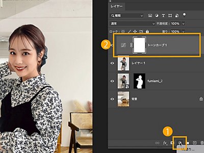 レイヤーパネル下部「塗りつぶしまたは調整レイヤーを新規作成」ボタンから「トーンカーブ」を追加し、「トーンカーブ1」のレイヤーを作成します。