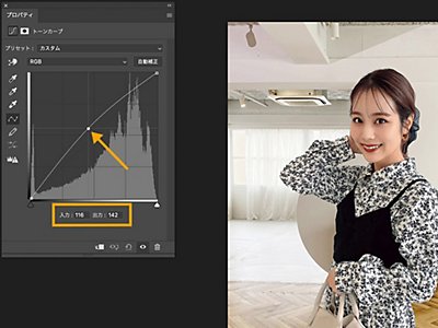 トーンカーブのプロパティから、カーブの中心を上にドラッグし、入力116、出力142に最終調整しましょう。