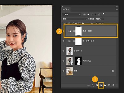 レイヤーパネル下部「塗りつぶしまたは調整レイヤーを新規作成」ボタンから「色相・彩度」を追加し、「色相・彩度1」のレイヤーを作成します。
