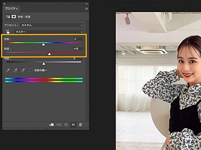 色相・彩度のプロパティパネルにて、彩度を+15、色相を-1にして、全体の色味を調整しましょう。