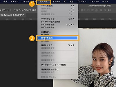 背景画像が見えないため、人物を切り抜く必要があります。「選択範囲>被写体を選択」をクリックすると、人物だけが選択されます。