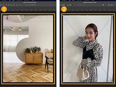 Photoshopで「background_2.jpg」を開きましょう。その上に、サンプルアセット内の人物画像「fumiami_2.jpg」をドラッグ&ドロップで追加します。