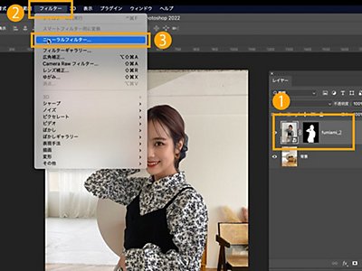 背景と人物の光源が異なるので、馴染むように調整します。「fumiami_2」レイヤーを改めて選択し、「フィルター>ニューラルフィルター」を選択します。