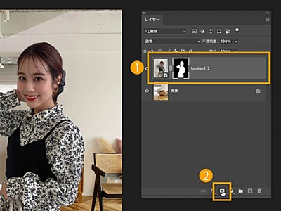 人物レイヤー「fumiami_2」が選択されているのを確認し、レイヤーパネル下部の「マスクを追加」ボタンをクリックしましょう。人物だけが切り抜かれます。