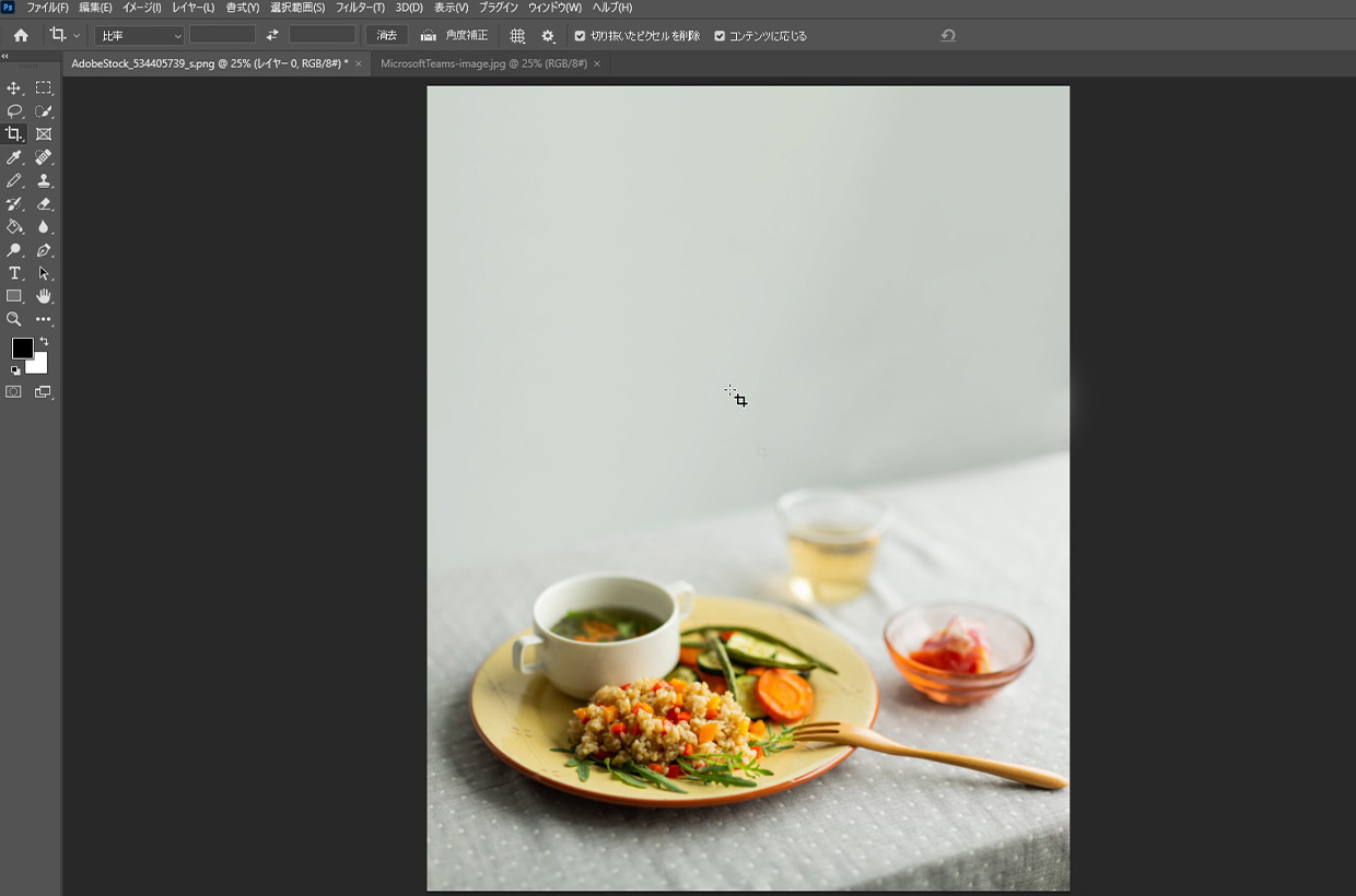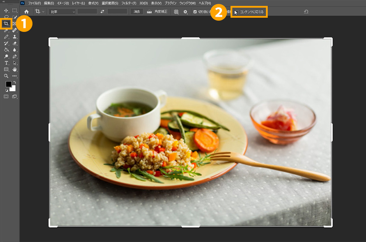 ダウンロードした練習⽤のファイルを開きます。ツールバーから、①「切り抜きツール」を選択。画⾯上部のオプションバーの②「コンテンツに応じる」のチェックボックスをオンにします。
