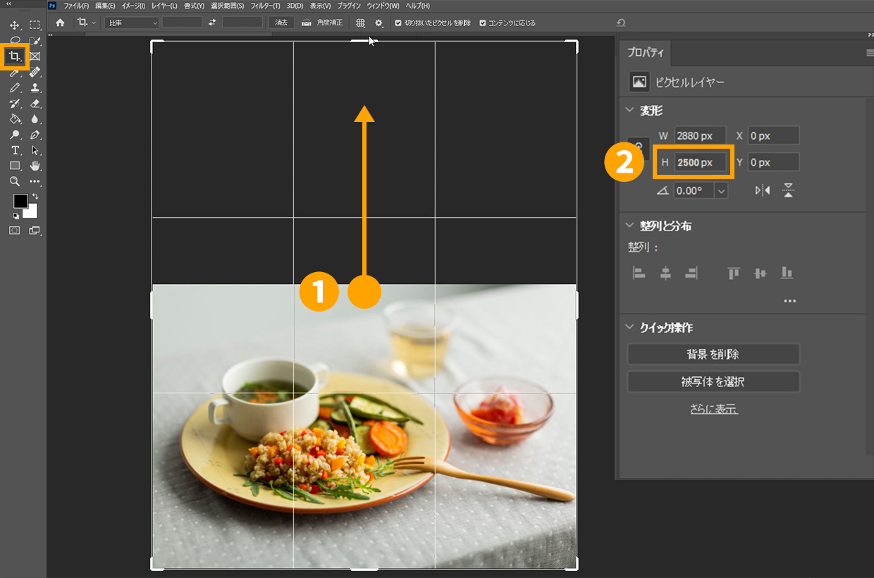 ①「画像の境界」を選択し、上にドラック。追加したい背景の分だけ画像の⾯積を追加します。今回は②⾼さ2500pxに変更しました。