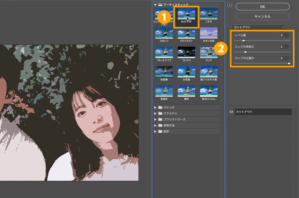 プレビュー表示の右にある①「カットアウト」を選択すると、写真が紙の質感に早変わりします。②「フィルターオプション」を使って好みの質感に調整します。