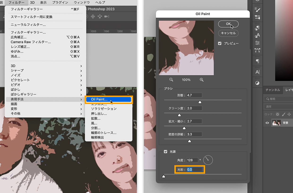 フィルター>「表現手法」>「Oil Paint(または油彩)」をクリック。詳細設定から質感を微調整すると、まるで油絵で描いたような画像に仕上がります。今回は、「光彩:0.0」に変更しました。