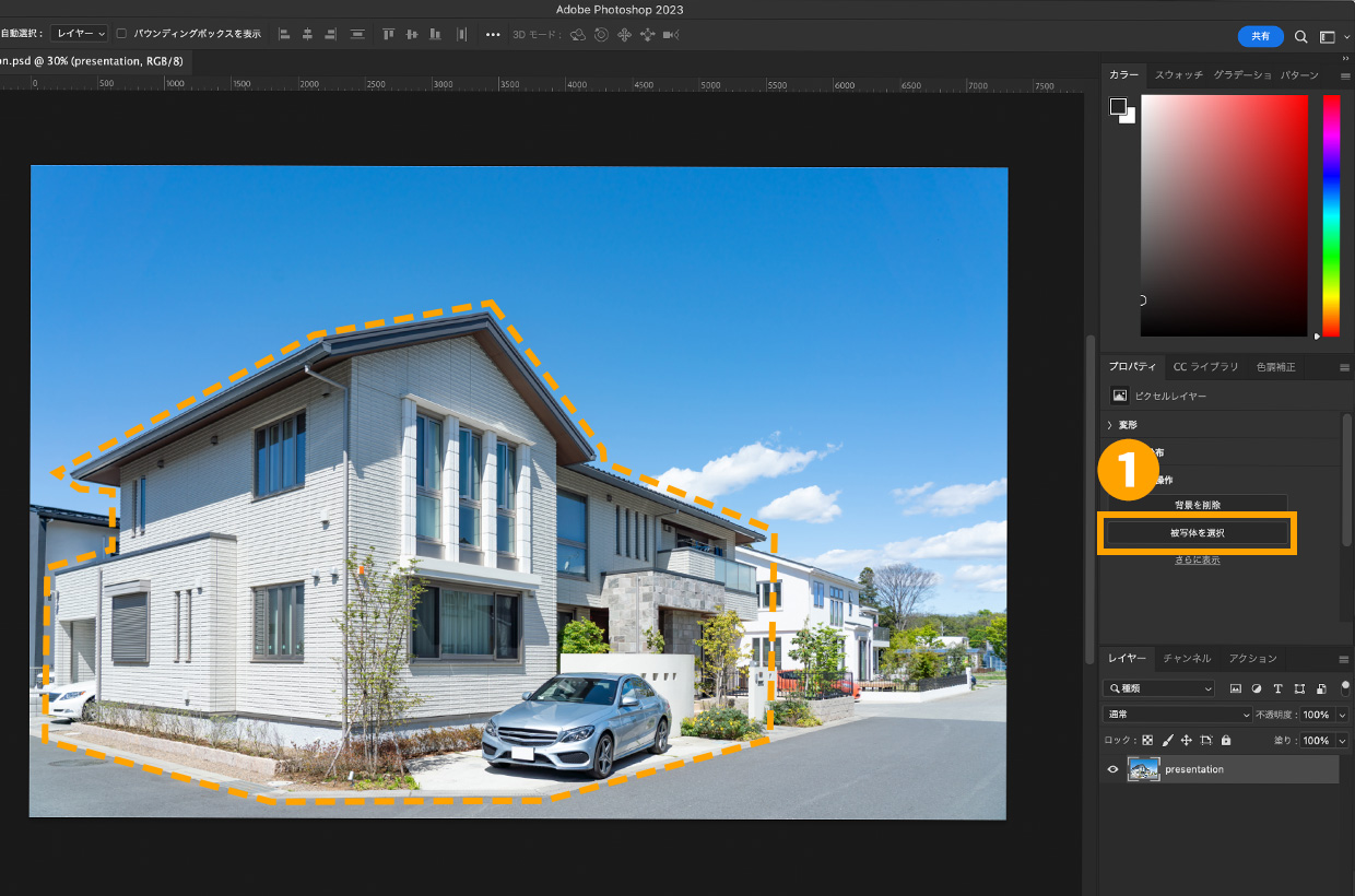 大まかに切り抜きたい部分を選択します。プロパティパネルから①「クイック操作」>「被写体を選択」をクリック。メインの被写体が識別され、自動的に選択されます。プロパティパネルにない場合は、メニューバー「選択範囲」>「被写体を選択」を選びましょう。