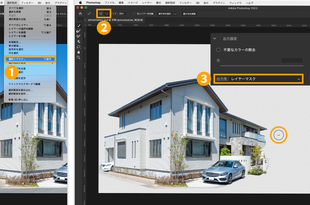 メニューバーから①選択範囲>「選択とマスク」をクリックし、細かい調整をしていきます。右側の属性パネルの「表示モード」を切り替えて選択範囲が見やすいモードを選択して、メニューバー左上部の②「+」「−」マークで切り抜きたい部分を細かく調整します。右側の属性パネルの③「出力設定」>「出力先」を「レイヤーマスク」に設定し、「OK」ボタンをクリックします。あっという間に選択した範囲を切り抜くことができました。