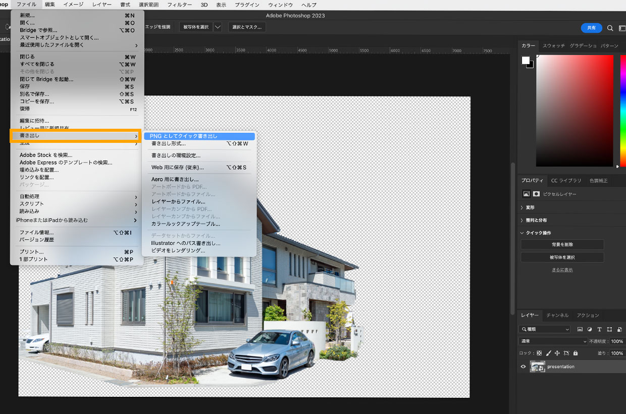 家を切り抜くことができたら、ファイル>「書き出し」からPNG形式で書き出しをしましょう。PowerPointなどのプレゼンテーションツールに切り抜いた画像を取り込んで貼り付け、文字や背景を加えて、提案資料を仕上げましょう。Photoshopをお使いの方ならAdobe Fonts の20,000点以上のフォントが無料で利用でき、ダウンロードしたフォントはプレゼンテーションツールでも利用ができます。フォントにもこだわった、ワンランク上の提案資料を作成してみましょう。