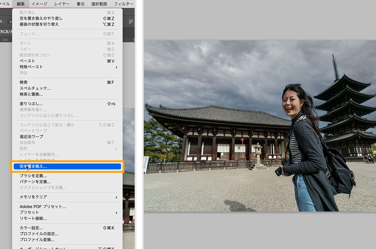 メニューバーから、編集>「空を置き換え」を選択。写真のくもり空を、自動で晴天の青空に換えます。