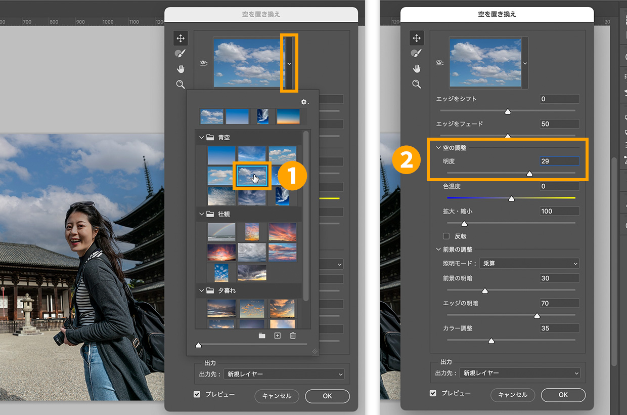 表示されたプリセットから、自分が思い描く理想の空をクリック。「空を置き換え」ダイアログで、空や前景のエッジや明度、カラーを調整して自然に馴染むように合成ができます。今回は、①雲のある青空を選択。②空の調整「明度:29」に変更しました。