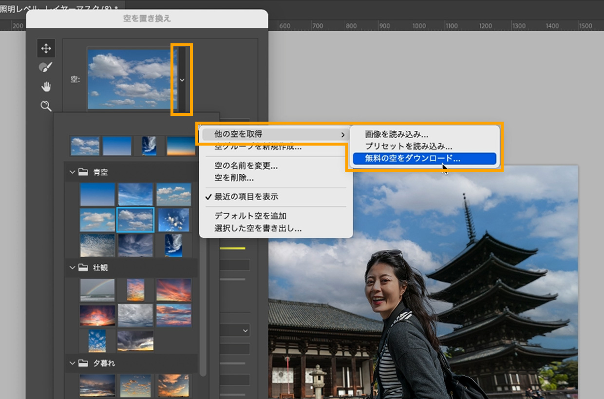 既存のプリセット以外にも、空の置き換えダイアログの、空の選択画面>右上の設定アイコンを押す>「他の空を取得」で自分で撮影した空の画像から新しい空のプリセットを作成し、無料のプリセットをダウンロードして読み込むこともできます。空の置き換えが終わったら、理想の青空の写真に文字やイラストを入れてイベントポスターやSNSの掲載画像などに使用してみてはいかがでしょうか。