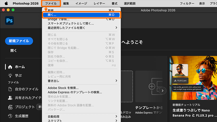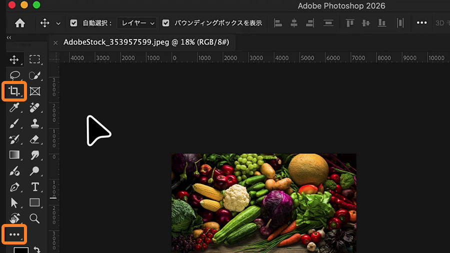 Photoshopを起動し、「ファイル」→「開く」からダウンロードした素材ファイル「Generative_Expand_vegetable.jpeg」を選択して開きます。