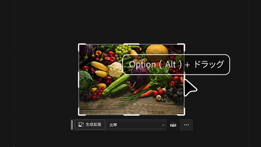 画像の周囲に表⽰されるフレームの右側のハンドルを「Alt∕Option」キーを押しながら外側にドラッグし、カンバスを左右に広げます。カンバスの左右にスペースができます。