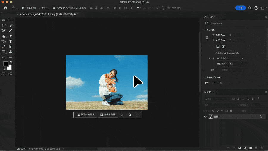 Photoshopを起動し、「ファイル」→「開く」からダウンロードした素材ファイル「AdobeStock_484070834.jpeg」を選択して開きます。
