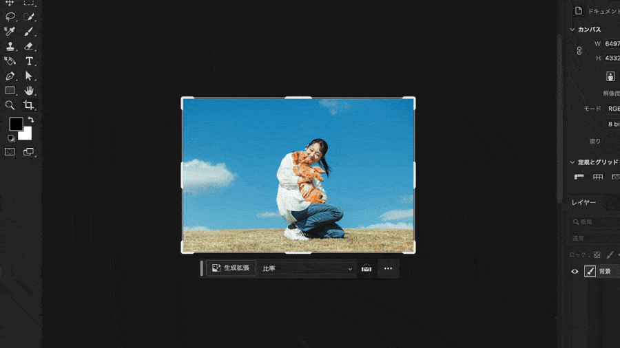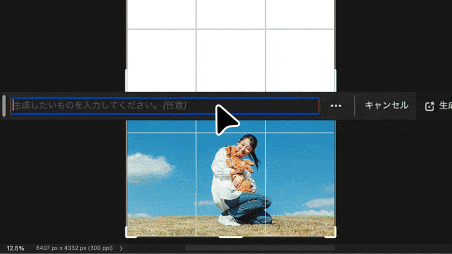 Photoshopの「⽣成拡張」は、カンバスを広げて「⽣成ボタン」をクリックするだけで⾃動的に画像を拡張できますが、あらかじめ追加したい要素をプロンプトに⼊⼒しておくことで、その要素が含まれた画像でカンバスの余⽩を埋めることができます。まずは下の動画で⼀連の制作⼯程を確認しましょう。