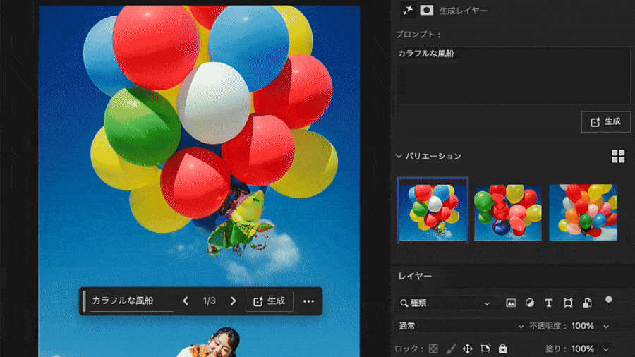 画像のすぐ下に表⽰されるコンテキストタスクバーのプロンプトフィールドに、「カラフルな⾵船」と⼊⼒して「⽣成」ボタンをクリックします。
