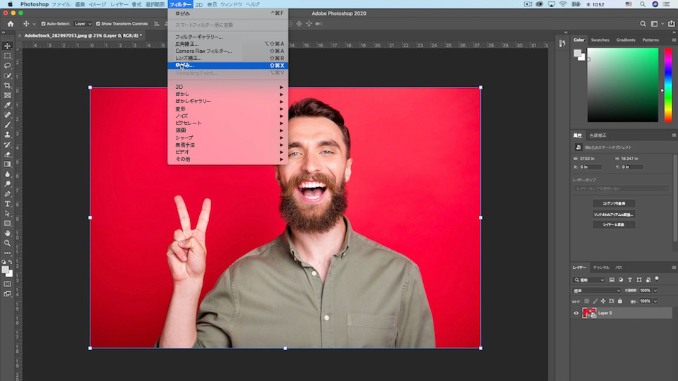 後でゆがみフィルターでさらに調整したい場合は、まず右クリック、またはControlキーを押しながらクリックしてから「 スマートオブジェクトに変換 」を選択します。