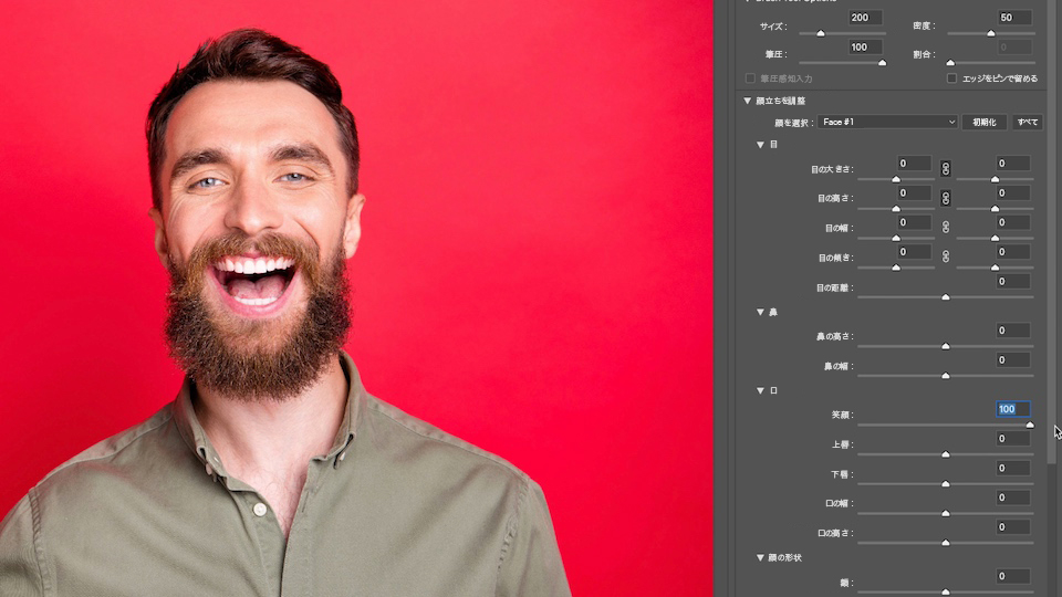 Photoshopのゆがみフィルターにある顔認識機能では、顔のパーツが自動的に検出されるため、表情の調整や誇張などができます。