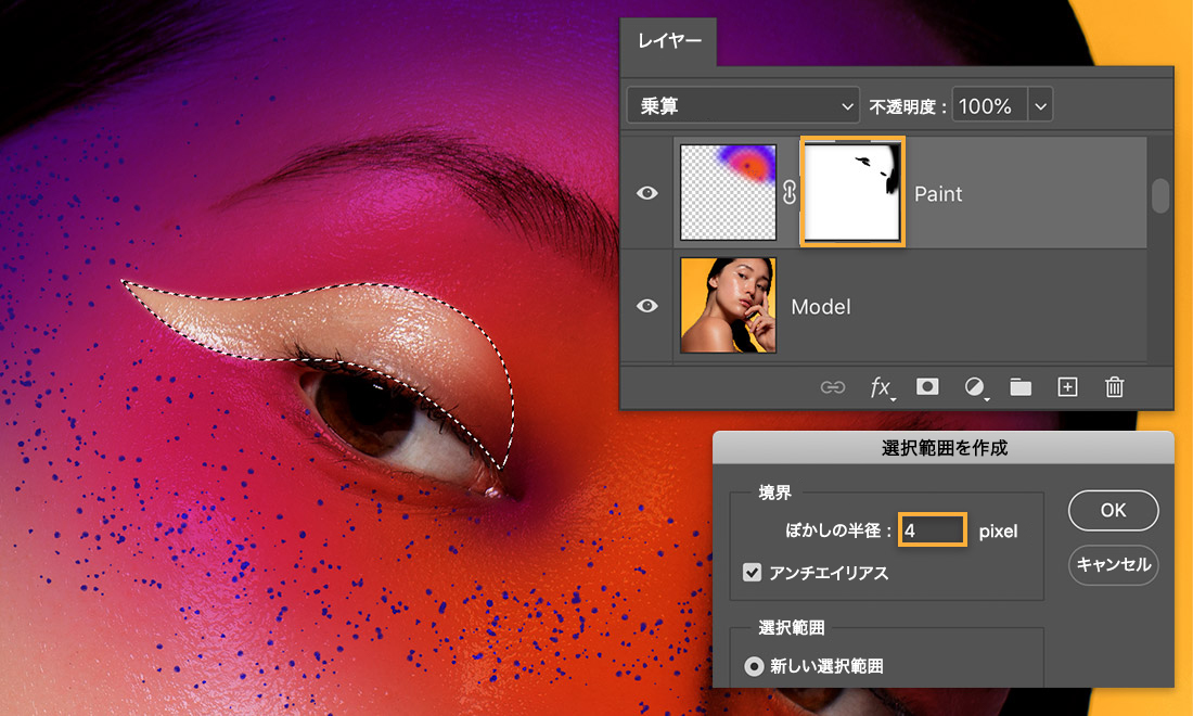 パスの定義が完了したら、右クリックして「選択範囲を作成」を選択し、「ぼかしの半径」を4に設定します。「Paint」レイヤーでまだマスクのサムネイルが選択されていることを確認してから、黒いブラシで選択範囲の内側をペイントします。滑らかにブレンドするために右側はソフトなままにしておきます。