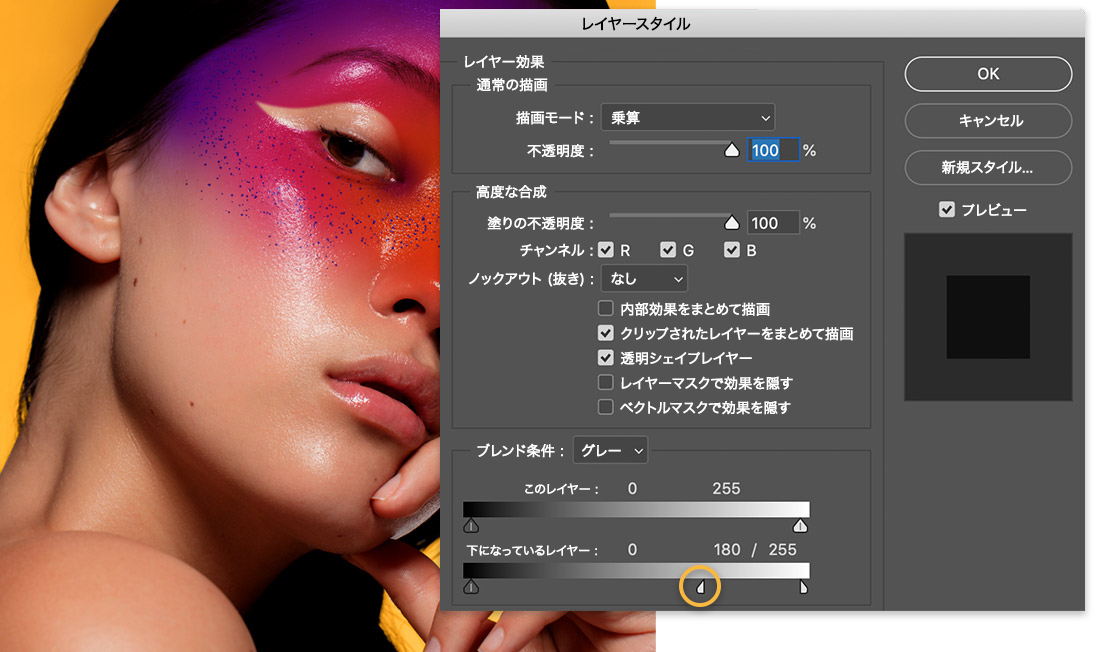 効果を微調整するために、Altキー(Windows)またはOptionキー(macOS)を押しながら「下になっているレイヤー」スライダーをクリックして左にドラッグします。