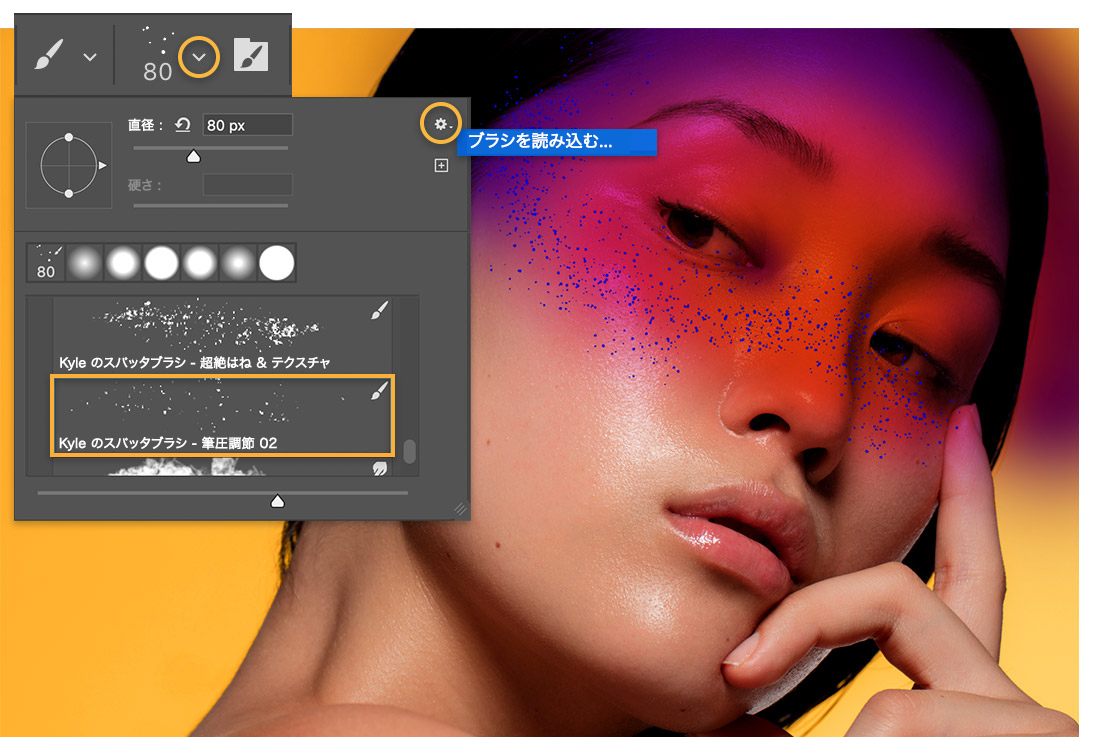Larson氏は、アートワークにデザイン要素を追加するためにブラシを読み込んでいます。このコンポジションでは、散布ブラシを使用して、頬や鼻筋にグリッター効果を加えています。同じカスタムブラシを使用するには、ブラシのプロパティダイアログで歯車アイコンをクリックし、「ブラシを読み込む」を選択して、練習用ファイルに含まれているspatter_brushes.abrファイルを見つけます。読み込んだブラシは、「 spatter_brushes 」というカテゴリの下に表示されます。