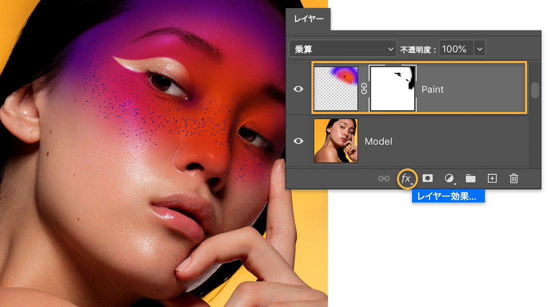 まるでモデルの肌に直接ペイントされているかのようにリアルなデジタルペイントにするために、レイヤーパネルから「レイヤー効果」レイヤースタイルを追加します。