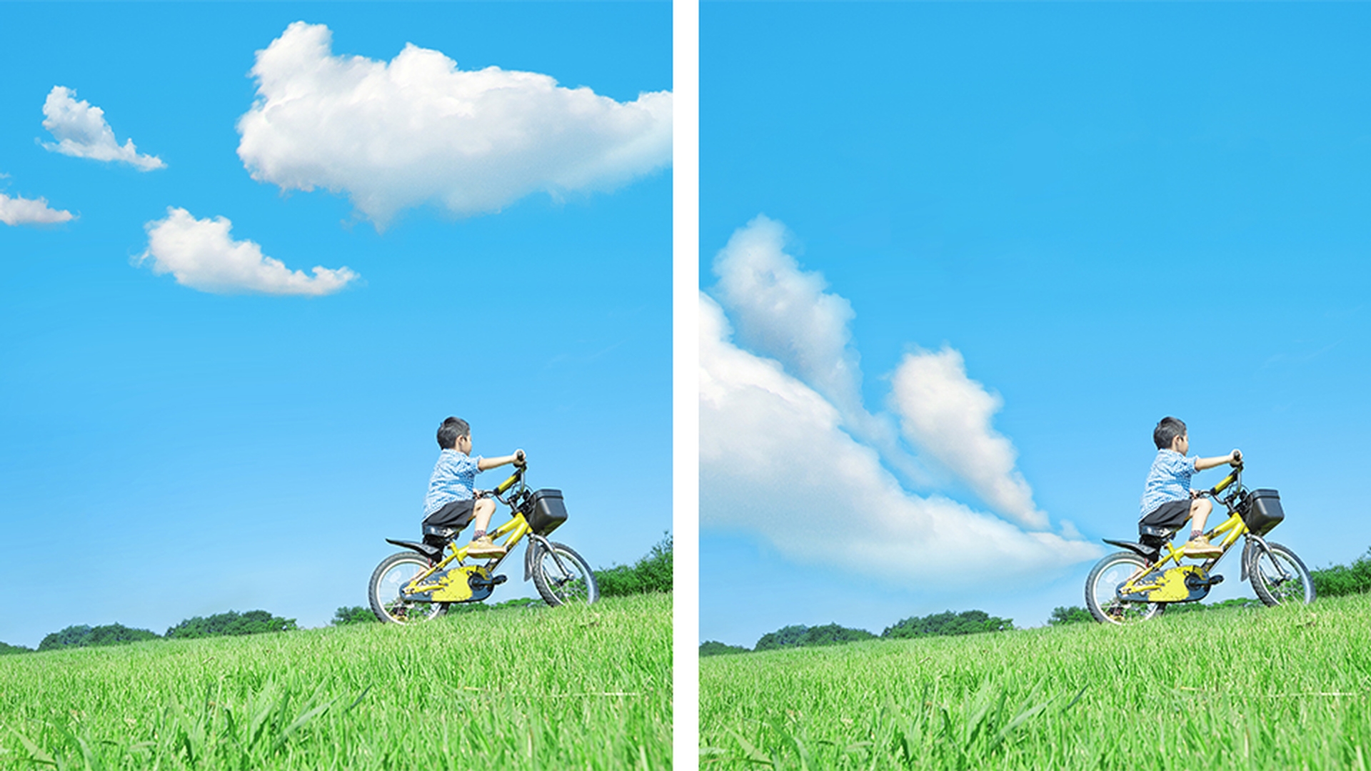 雲の形と位置が決まったら、確定ボタン [◯] をクリックしてコンテンツに応じた移動を適用します。元の雲があった場所は自動的に空の色に塗りつぶされ、移動した雲の境界線は周囲の背景と馴染みました。