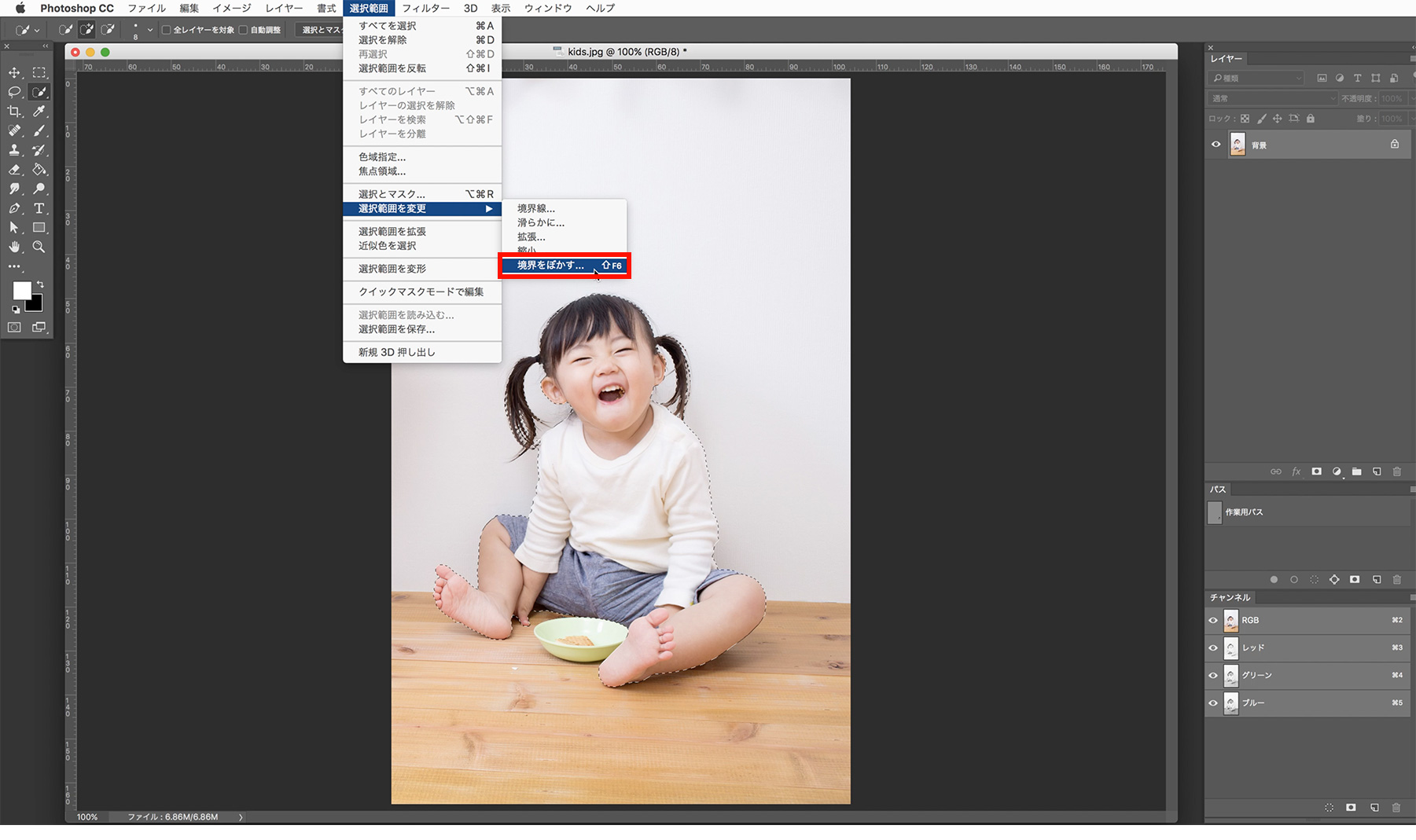 アプリケーションメニューの[選択範囲]→[選択範囲を変更]→[選択範囲をぼかす]をクリックし、ぼかしの半径に任意の数値を入力して[OK]をクリックします。