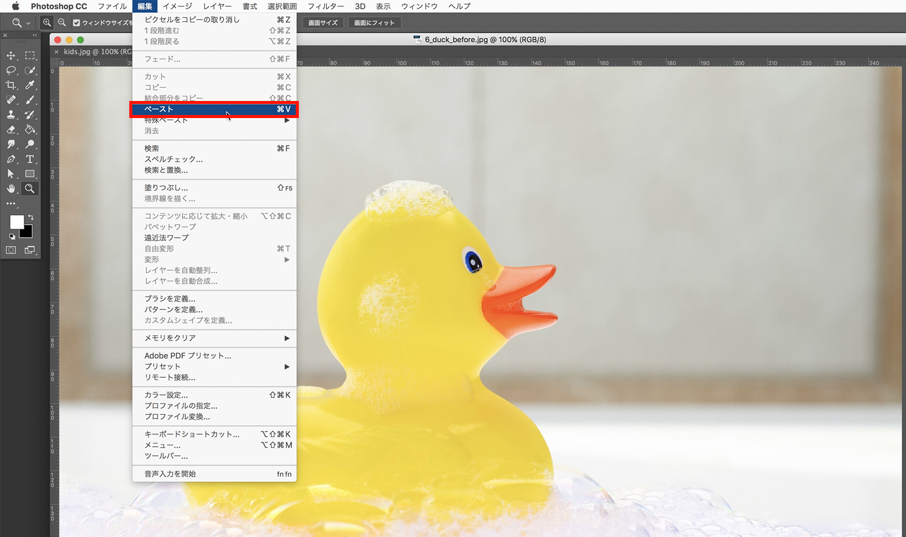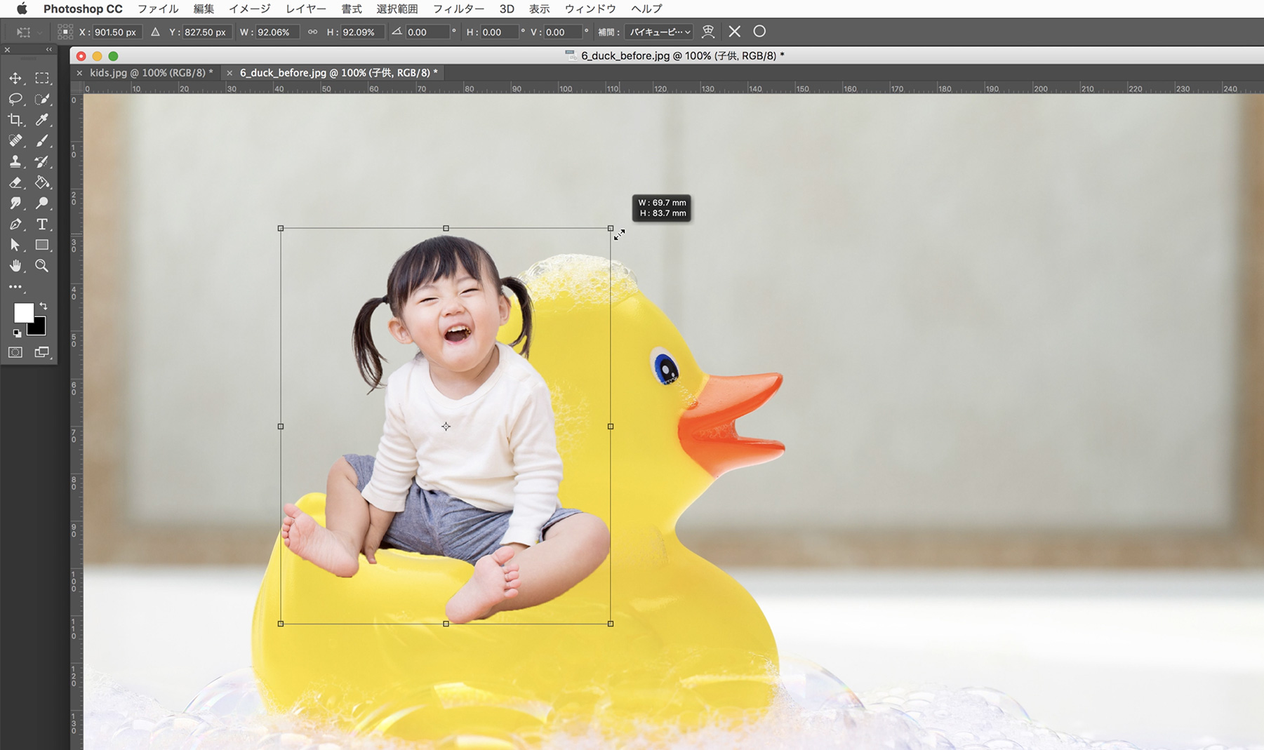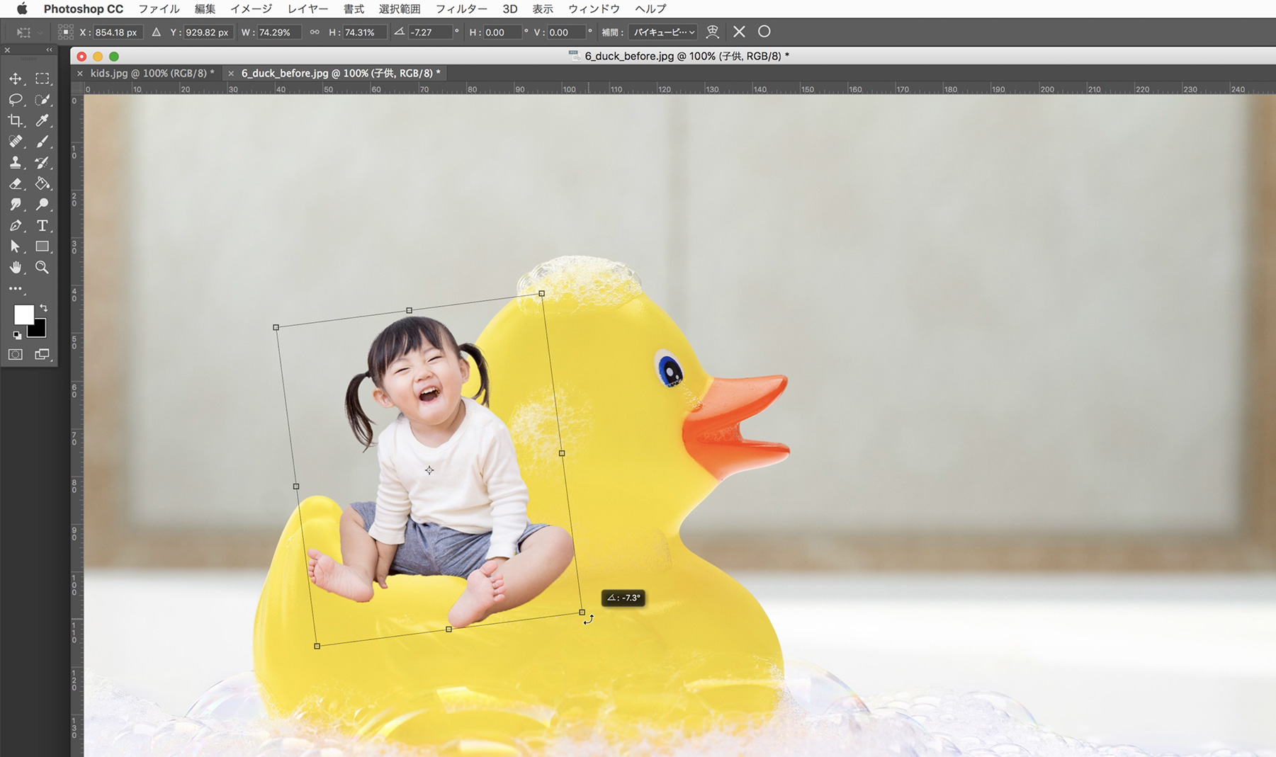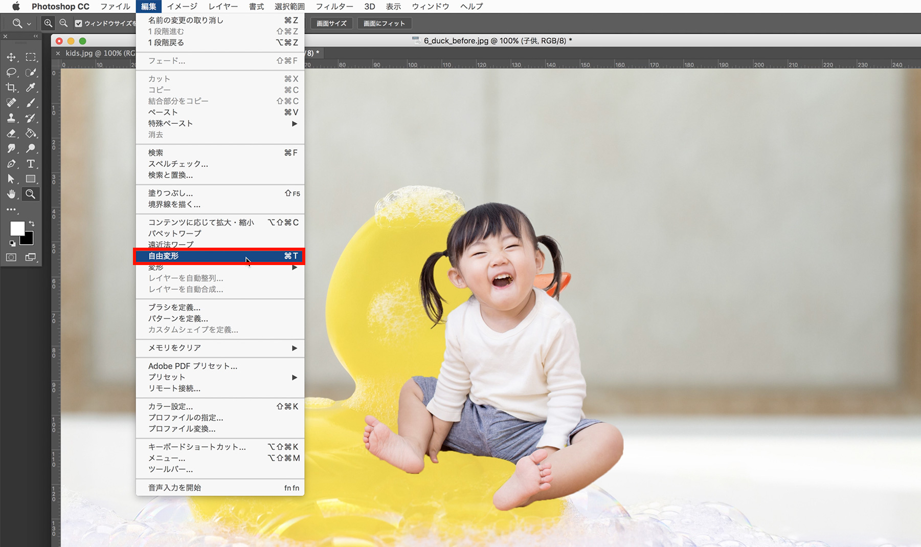 レイヤーパネルの【子供】レイヤーをクリックして選択し、アプリケーションメニューの[編集]→[自由変形]をクリックします。